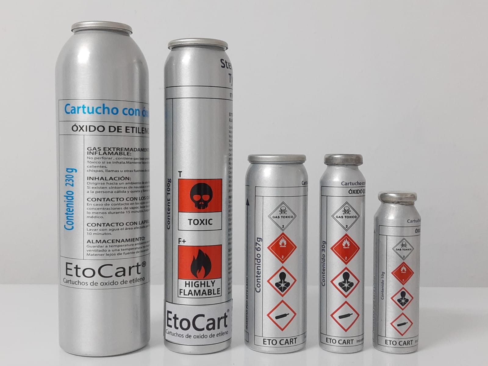 Insumos ETO ® cuenta con una línea completa de Cartuchos marca EtoCart ® con Óxido de Etileno de las siguientes medidas: 7,10,25,67,100,128,134,180,200,220 y 230gr.
